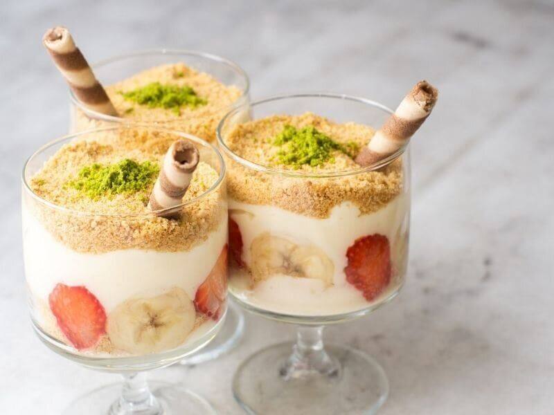 İtalyan usulü kremalı tatlı, meyve sosu ile servis edilir.